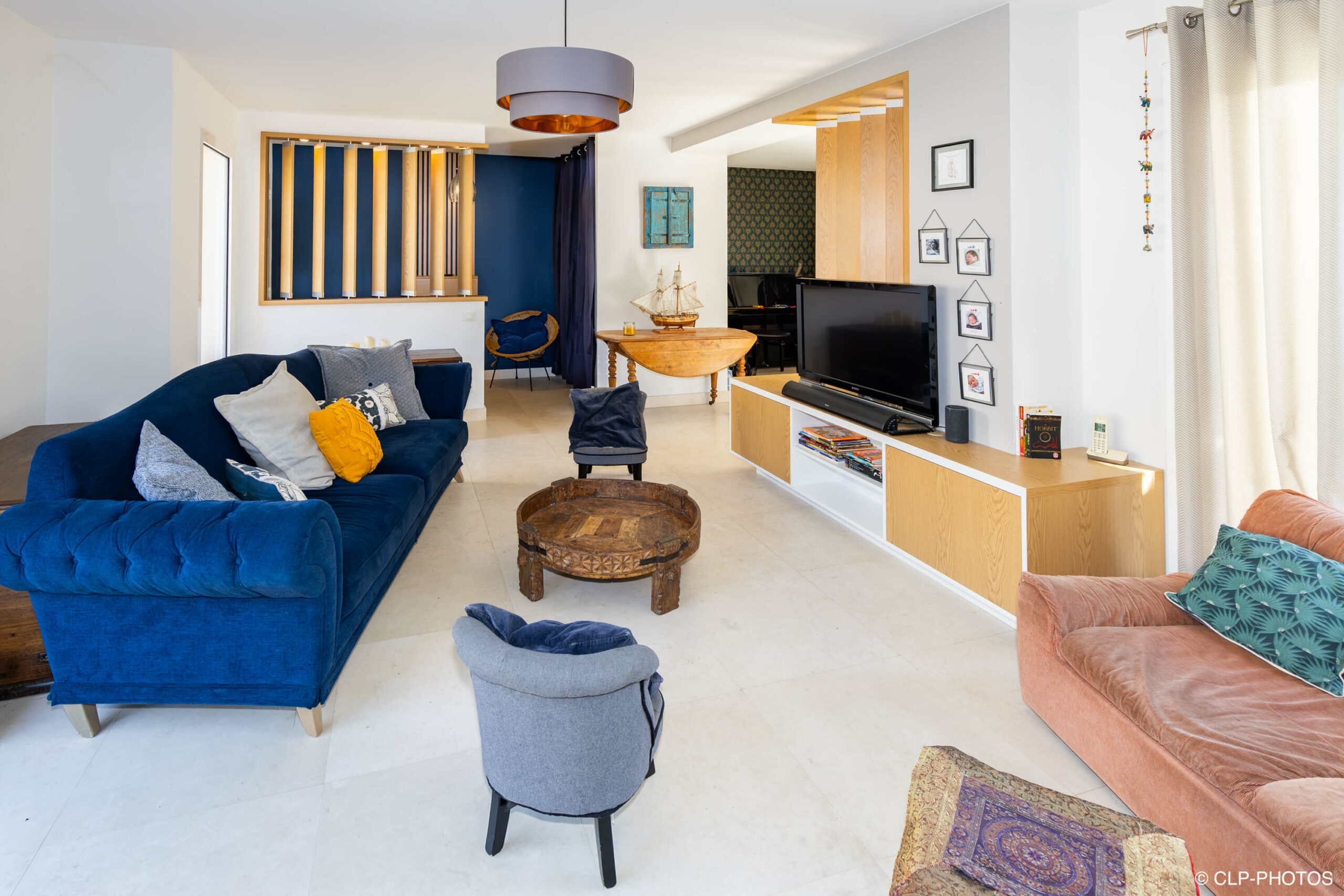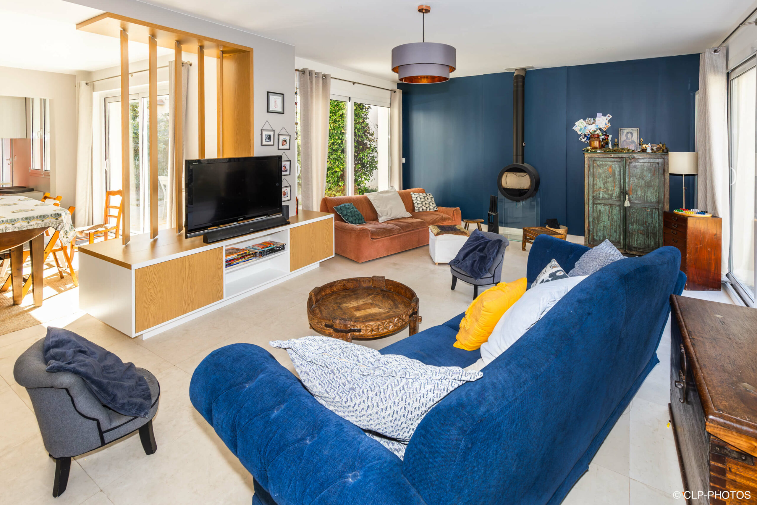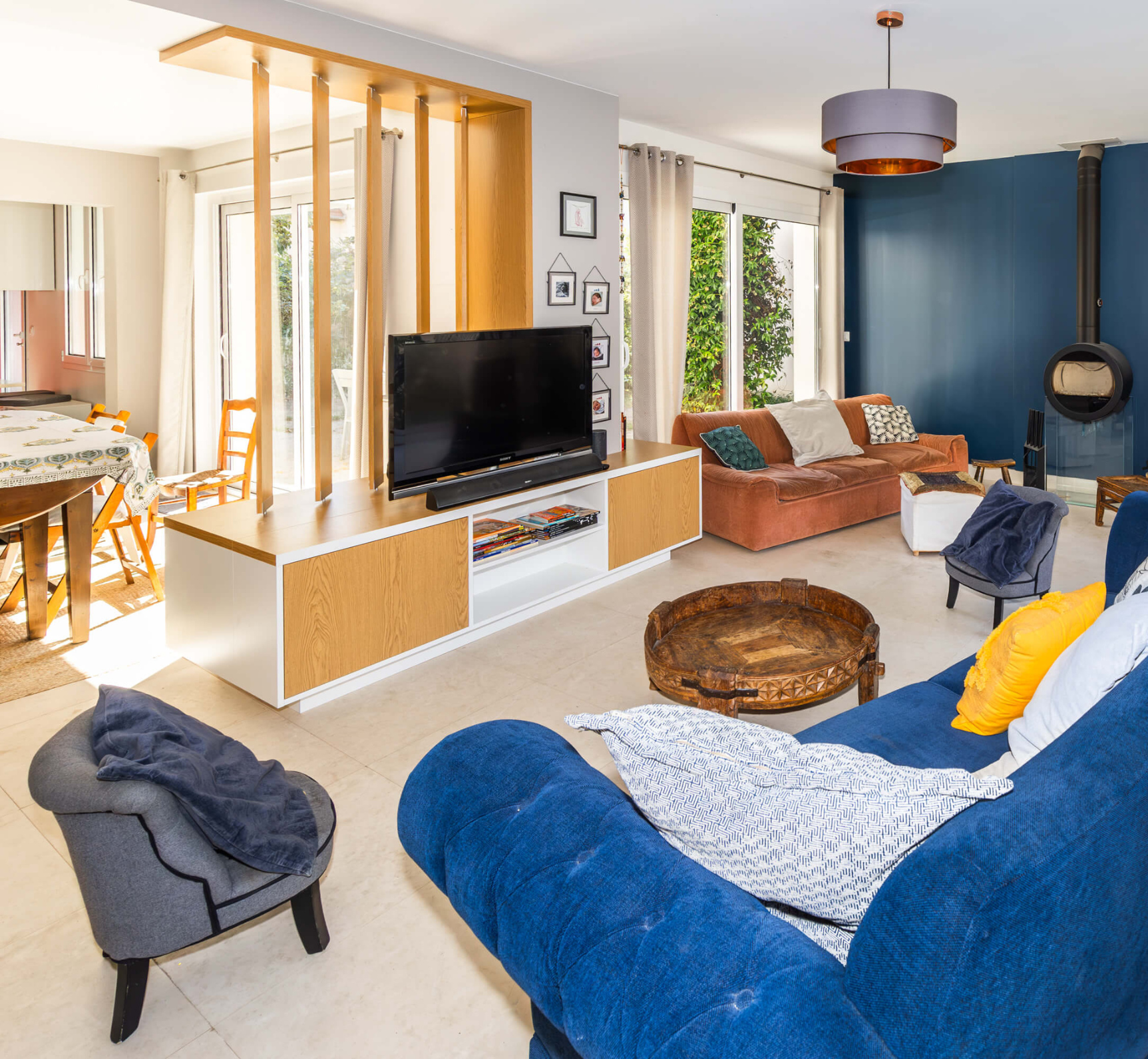 Le salon, modernisé, s’ouvre désormais sur la salle à manger grâce à un meuble TV sur mesure, à la fois fonctionnel et esthétique.