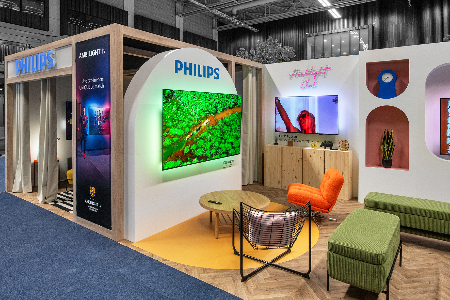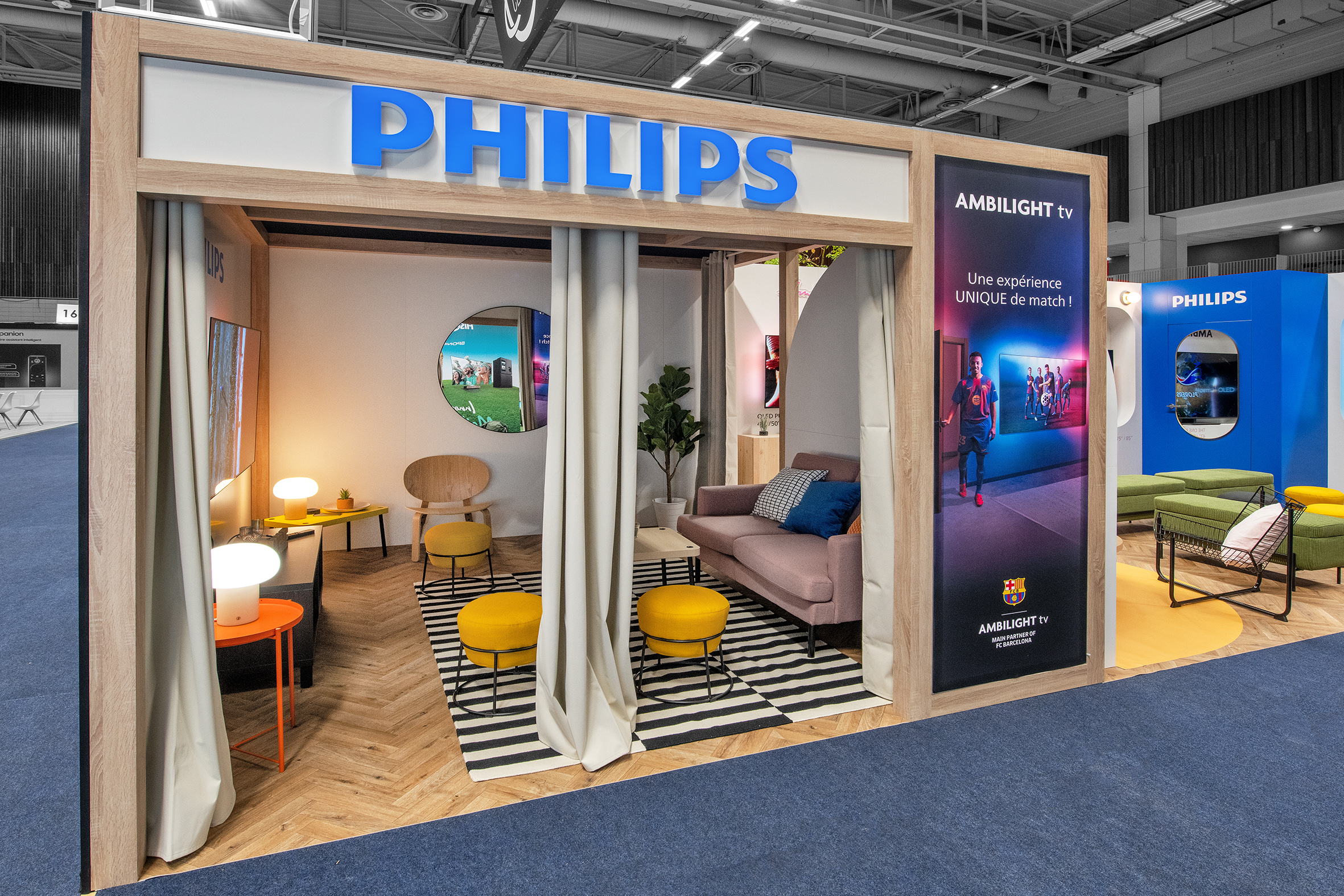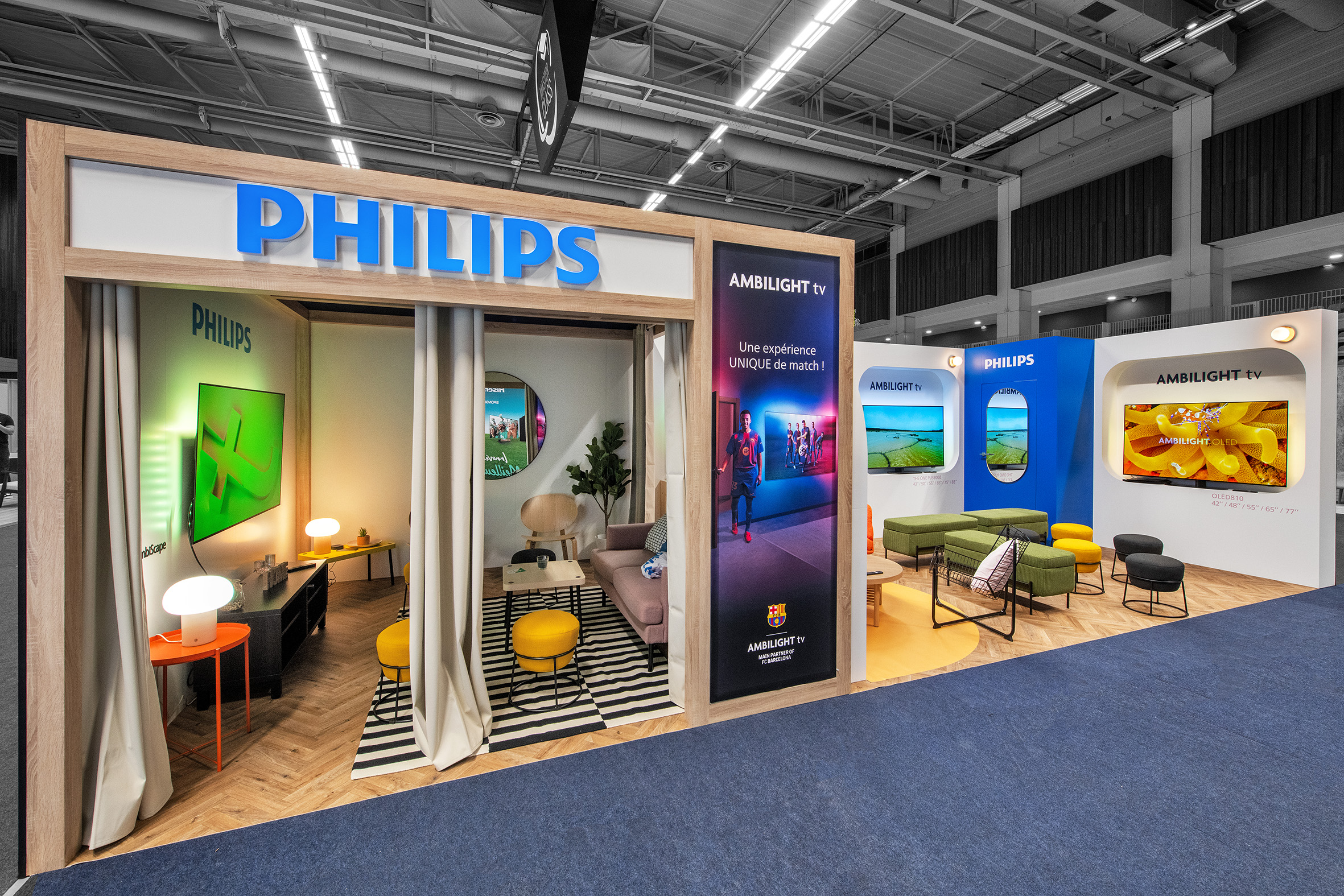 Ici, l’enjeu est clair : ne pas juste exposer des télévisions, mais faire ressentir l’expérience Ambilight.